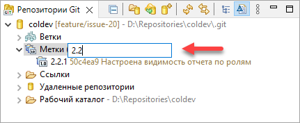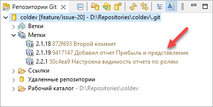 Просмотр имеющихся меток в Git делается просто. Достаточно перейти в панель Репозитории Git и раскрыть ветку Метки вашего репозитория.