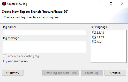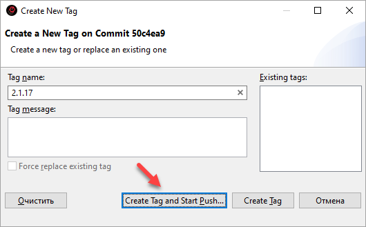 Чтобы создать метку для текущего коммита в панели Навигатор нажмите в контекстном меню проекта. Откроется диалог создания метки.