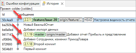 Метки вы можете видеть не только в панели Репозитории Git, но и в панели История, рядом с соответствующими коммитами.