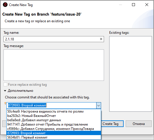 Также вы можете помечать недавние коммиты и из панели Навигатор. Когда вы создаете новую метку (), раскройте в диалоге группу Дополнительно и выберите тот коммит, который вас интересует.