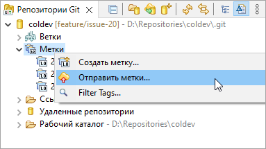 Во-вторых, в панели Репозитории Git вы можете контекстными командами Отправить метки... и Отправить метку... отправить сразу все, или только одну выбранную метку в удаленный репозиторий.