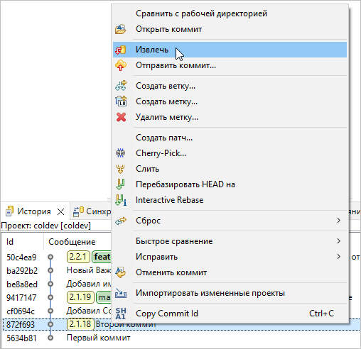 Если вы хотите просмотреть версии файлов, на которые указывает метка, вы можете извлечь коммит, помеченный этой меткой. Для этого в панели История, на нужной вам метке, выполните контекстную команду Извлечь.