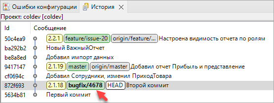 Таким образом «отсоединенный HEAD» это вполне нормальное состояние, если вы хотите только посмотреть состояние вашей конфигурации на какой-то момент, отмеченный меткой. Если же вы хотите вносить изменения начиная с этого момента, то после того, как вы извлекли метку, сначала создайте новую ветку (в примере — bugfix/4678), а потом уже изменяйте конфигурацию.