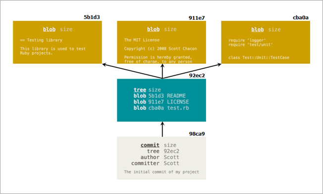 Когда вы фиксируете изменения, Git вычисляет контрольные суммы каждого подкаталога (в вашем случае это только основной каталог проекта) и сохраняет это в репозитории как объект дерева каталогов. Затем Git создает объект коммита с метаданными и указателем на основное дерево проекта для того, чтобы можно было воссоздать этот снимок в случае необходимости.
