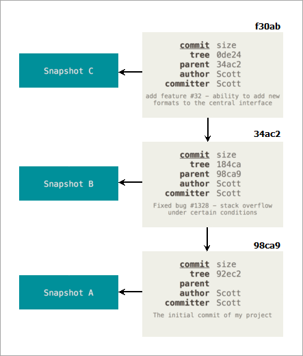 Когда вы фиксируете изменения, Git сохраняет коммит в виде объекта, который содержит указатель на снимок подготовленных данных. Этот объект так же содержит имя автора и email, сообщение и указатель на коммит или коммиты, непосредственно предшествующие данному (его родителей). У первоначального коммита родитель отсутствует, у обычного коммита есть один родитель, и есть несколько родителей для результатов слияния веток.