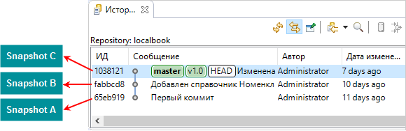 Если вы сделаете изменения и создадите еще один коммит (Snapshot B), то он будет содержать указатель на предыдущий коммит.