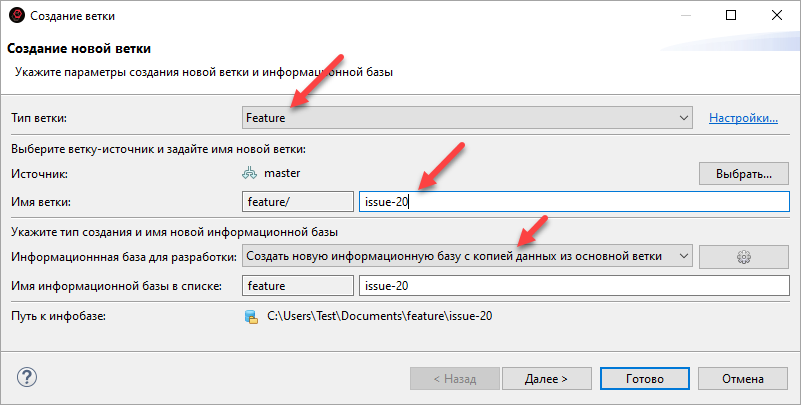 Стандартно при создании новой ветки 1C:EDT предлагает создать новую информационную базу с копией данных из основной ветки. Эти данные вы сможете использовать для отладки изменений в новой ветке. Таким образом больше в этом диалоге ничего менять не нужно и можно нажать Готово.