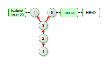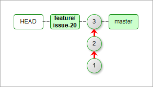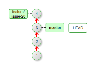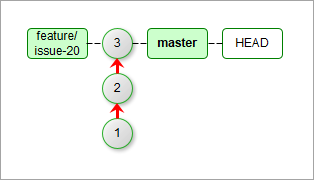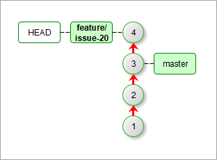 Это интересно, потому что указатель на вашу ветку feature/issue-20 переместился вперед, а master все еще указывает на тот коммит, где вы были в момент переключения веток.