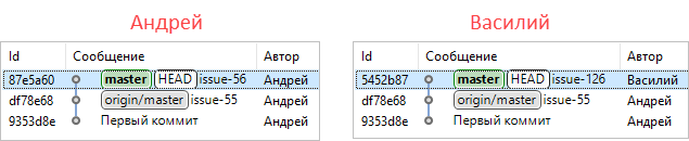Представьте, что Андрей и Василий работают вместе над одной задачей (назовем ее feature/issue-18), в то время как Василий и третий разработчик, Николай, работают над другой (назовем ее feature/issue-300).