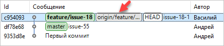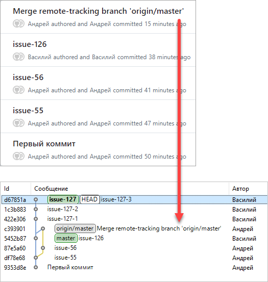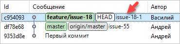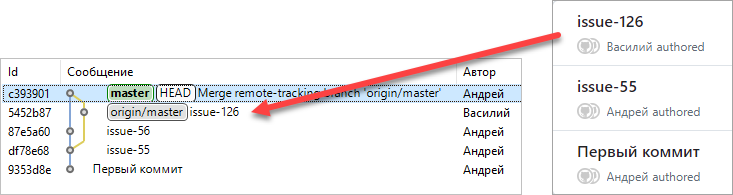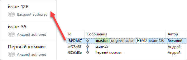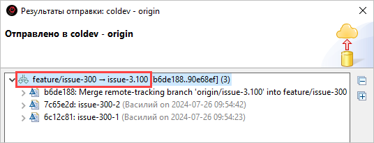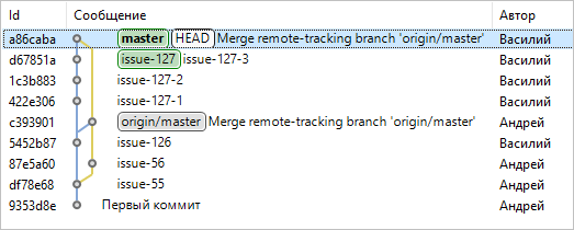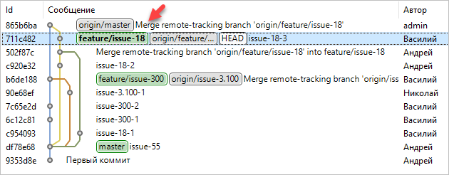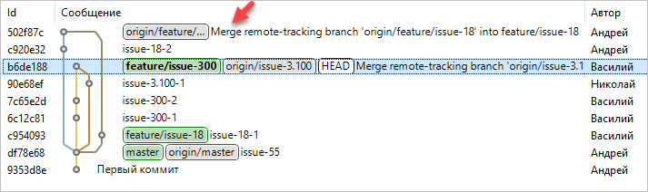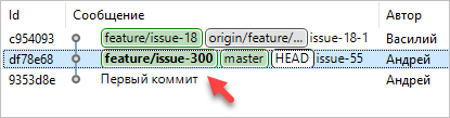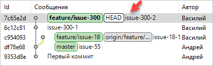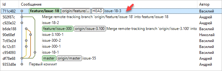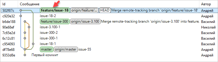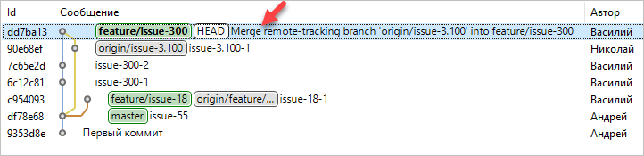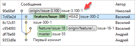 Обратите внимание, что, как Василий и хотел, его локальная ветка feature/issue-300 была отправлена на сервер в ветку issue-3.100. В результате его история коммитов имеет следующий вид.