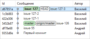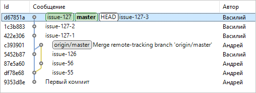 Тем временем Василий создал тематическую ветку с названием issue-127 и сделал в ней три коммита. Он еще не получил изменения Андрея, поэтому история коммитов у него выглядит следующим образом.