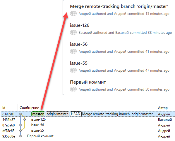 В результате история коммитов Андрея выглядит так, как показано на рисунке: