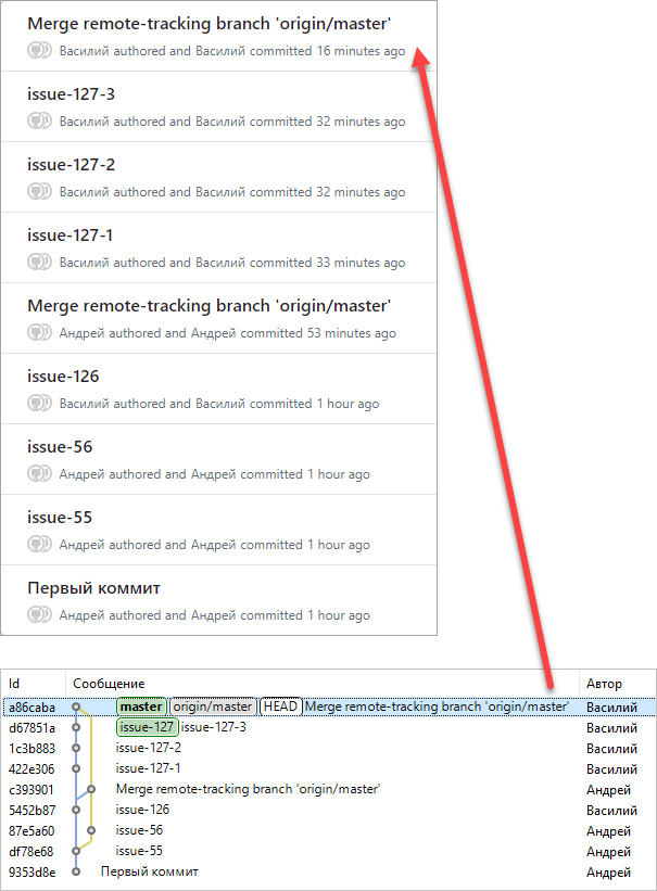 Слияние проходит нормально, и теперь история коммитов Василия выглядит так, как показано на рисунке: