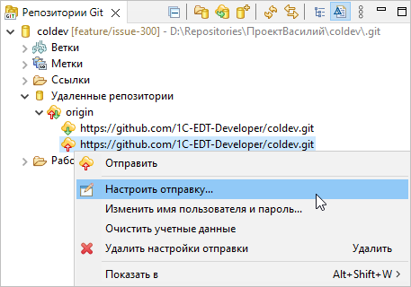 Для этого Василий переключается в перспективу Git, в панели Репозитории Git раскрывает удаленный репозиторий и на push-ветке выполняет команду Настроить отправку....