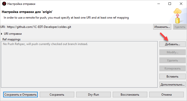 В открывшемся окне он нажимает Добавить... чтобы создать новое соответствие ссылок (refspec).