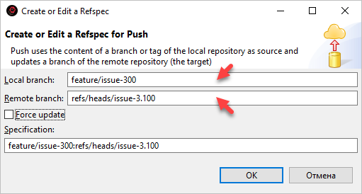 В данном случае ему нужно задать соответствие между ссылкой на локальную ветку и ссылкой на удаленную ветку. Он заполняет поля оба поля так, как показано на рисунке. Поле Specification 1C:EDT заполняет автоматически.
