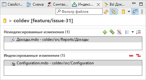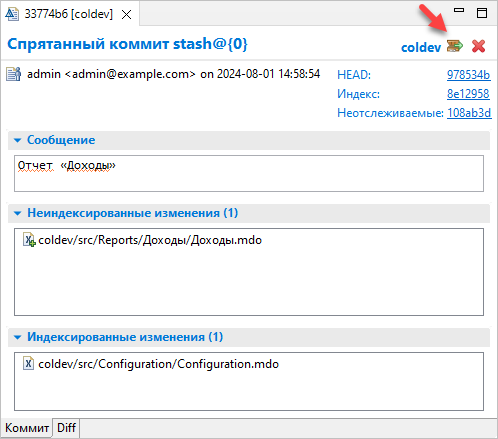 1C:EDT откроет редактор коммита, в котором будут показаны сообщение, неиндексированные и индексированные изменения. Так происходит потому, что вы можете припрятать изменения, находясь в одной ветке, а затем переключиться на другую и попробовать восстановить эти изменения.
