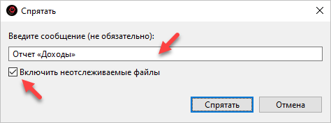 Припрятанных изменений может быть несколько. Чтобы у вас была возможность отличить одни свои изменения от других, задайте понятное вам название для этих изменений. Установите флажок Включить неотслеживаемые файлы и нажмите Спрятать.