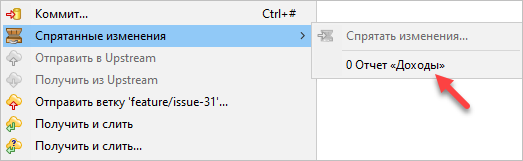 Для того, чтобы припрятать изменение в выделенное для этого специальное хранилище, в панели Навигатор нажмите в контекстном меню проекта.