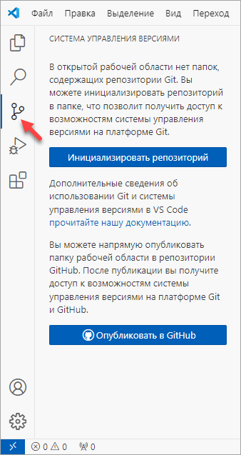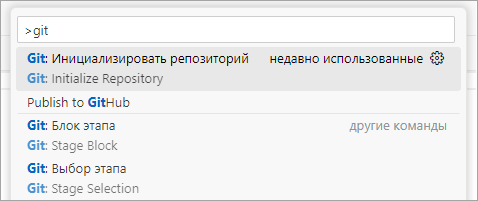 Команды для работы с Git находятся в палитре команд и в представлении Система управления версиями (Source Control).