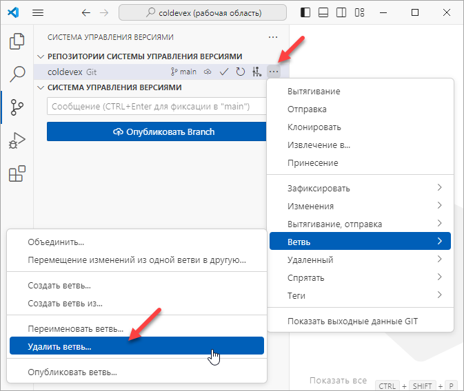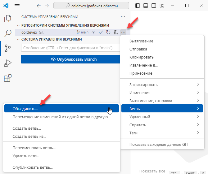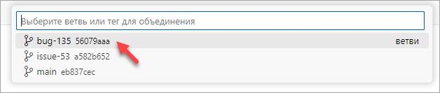 Предположим, вы решили, что работа по задаче №53 закончена, и ее можно влить в ветку main. Для этого, как вы делали это с веткой bug-135 ранее, нужно переключиться на ветку, в которую вы хотите включить изменения (main), и выполнить команду () в дополнительном меню репозитория.