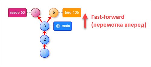 Другими словами, если в коммит вливается тот коммит, до которого можно добраться, двигаясь по истории прямо, Git упрощает слияние, просто перенося указатель метки вперед (так как нет разветвления в работе). Это называется перемотка вперед (fast-forward).