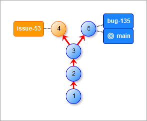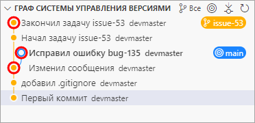 Обратите внимание на то, что все изменения из ветки bug-135 не включены в вашу ветку issue-53. Если их нужно включить, вы можете влить ветку main в вашу ветку issue-53. Либо вы можете отложить слияние этих изменений до завершения работы, а затем переключиться на ветку main и влить ветку issue-53 в main.