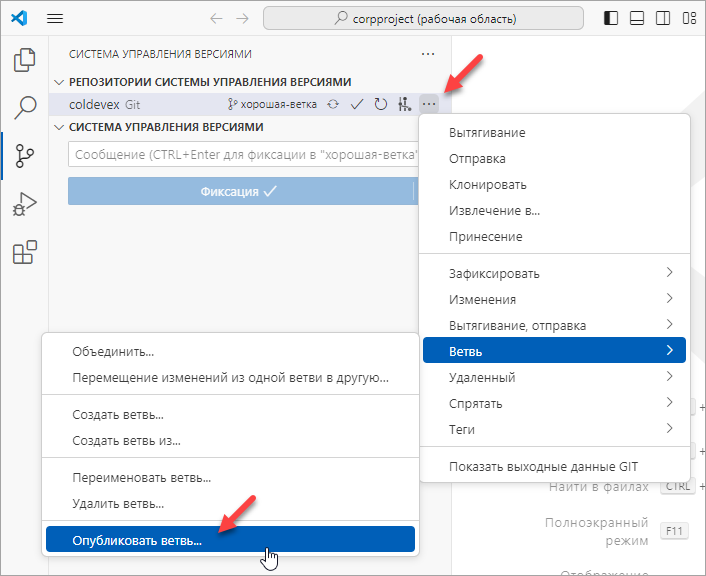 Чтобы все остальные увидели исправленную ветку в удаленном репозитории, отправьте ее туда. Для этого нажмите ().