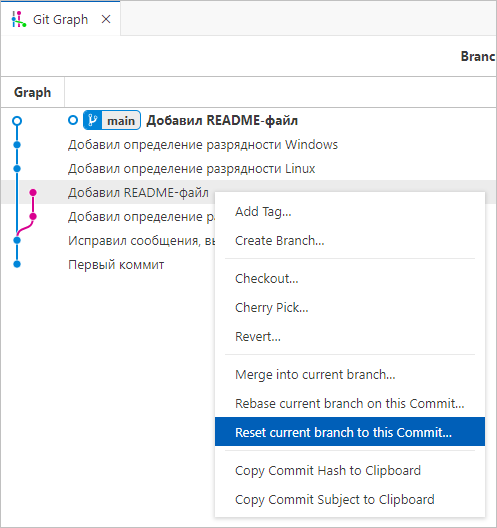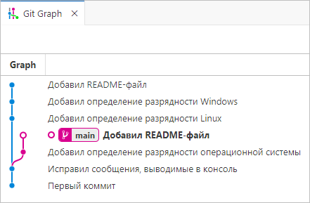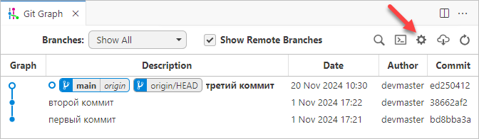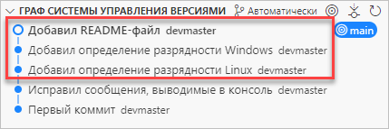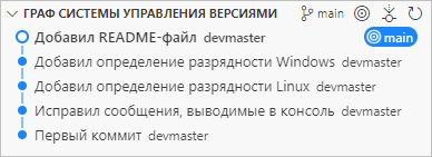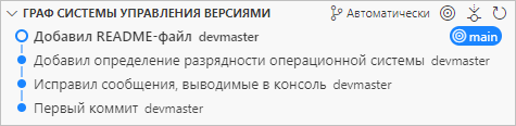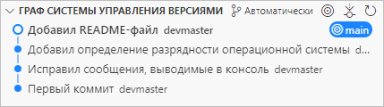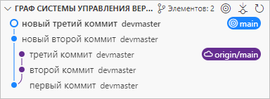 В расширении Git Graph вы включили отображение дополнительных коммитов и видите историю в «честном» виде. В таком виде она удобна, например, для исправления ошибочных действий. Но для обычной работы удобнее видеть только те ветки, которые имеют непосредственное отношение к выполняемой вами задачи. Например, в разделе Граф системы управления версиями (Source Control Graph).