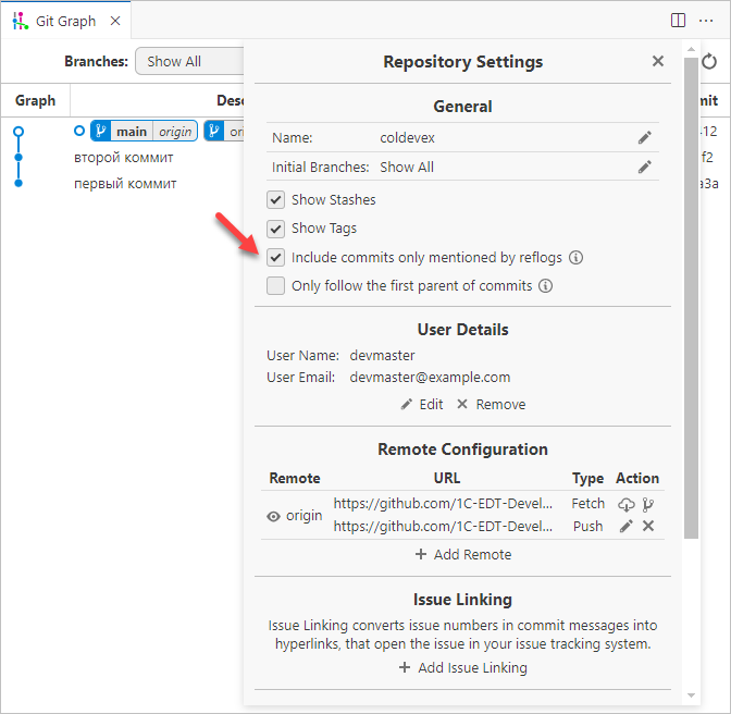 Установите флажок Include commits only mentioned by reflogs. Благодаря этому флажку, вы сможете видеть больше коммитов, чем обычно, например, коммиты, которые уже не принадлежат существующим веткам.