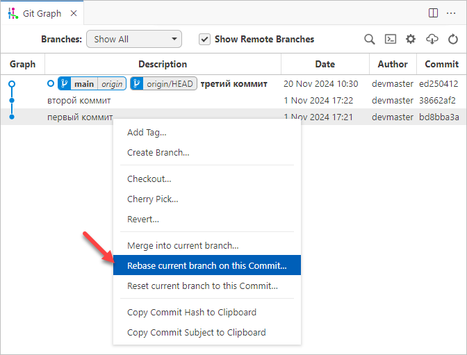 Чтобы исправить эти коммиты, вы выделяете предшествующий им коммит, и нажимаете Rebase current branch on this Commit....
