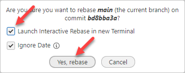 Visual Studio Code предложит вам выполнить интерактивное перебазирование во встроенном терминале. Установите флажок Launch Interactive Rebase in new Terminal и нажмите Yes, rebase.