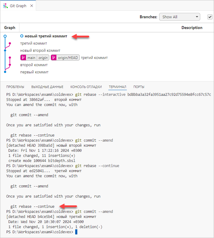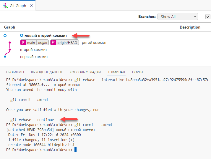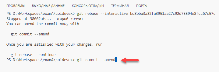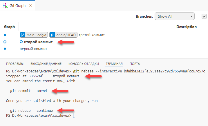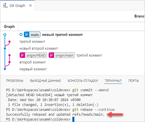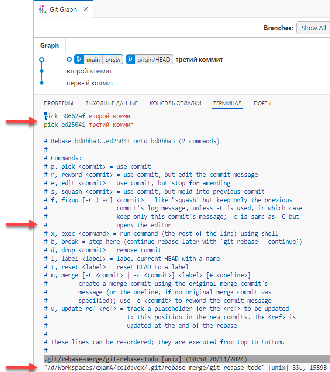 Visual Studio Code откроет терминал и покажет в нем план перебазирования с подсказками.