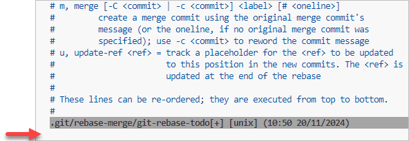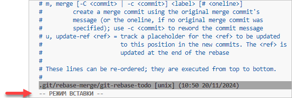 Сейчас встроенный терминал находится в режиме команд, об этом говорит последняя строка. Чтобы отредактировать план перебазирования, нужно перевести терминал в режим редактирования. Терминал использует команды популярного в Linux текстового редактора Vim.