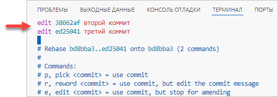 В данном случае план перебазирования включает в себя два коммита, которые перечислены в начале в обратной последовательности: сначала будет перебазирован второй коммит, после этого — третий коммит.