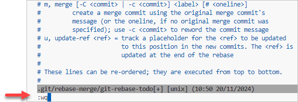 Как и в случае с планом перебазирования, вы входите в режим редактирования (Insert), изменяете сообщение коммита, выходите из режима редактирования (Esc) и сохраняете и закрываете редактор («:wq»).