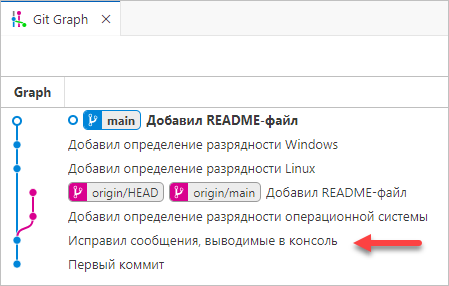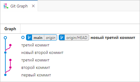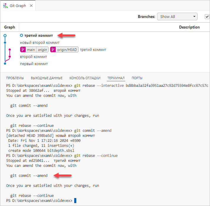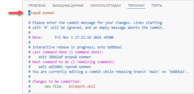 После того, как вы изменили сообщение и закрыли текстовый редактор, Visual Studio Code зафиксирует ваши изменения в новом третьем коммите и будет ожидать дальнейших указаний.