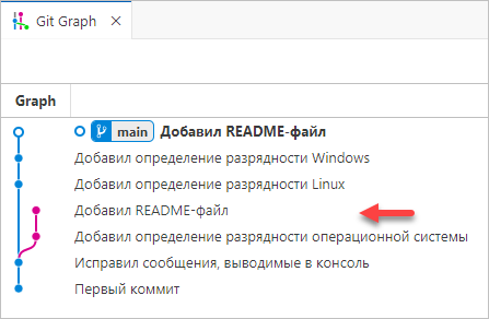Git применит последний коммит (Добавил README-файл) из плана перебазирования, и ваша история примет следующий вид.