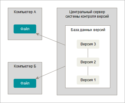 Следующая серьезная проблема, с которой сталкиваются люди, это необходимость взаимодействовать с другими разработчиками. Для ее решения были придуманы централизованные системы контроля версий (Centralized Version Control System). Примером такой системы является, например, хранилище конфигурации, которое использует платформа «1С:Предприятие», а также системы CVS, Subversion и Perforce. Они имеют один сервер, содержащий все версии файлов, и некоторое количество клиентов, которые извлекают файлы из этого центрального хранилища. Применение централизованных систем контроля версий являлось стандартом на протяжении многих лет.