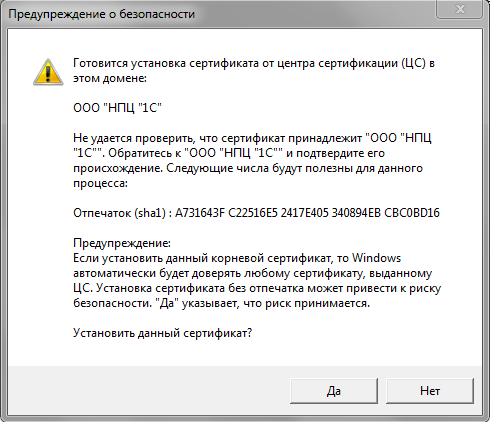5. Если в завершении процесса установки сертификата появится предупреждение, то нужно нажать кнопку "Да":