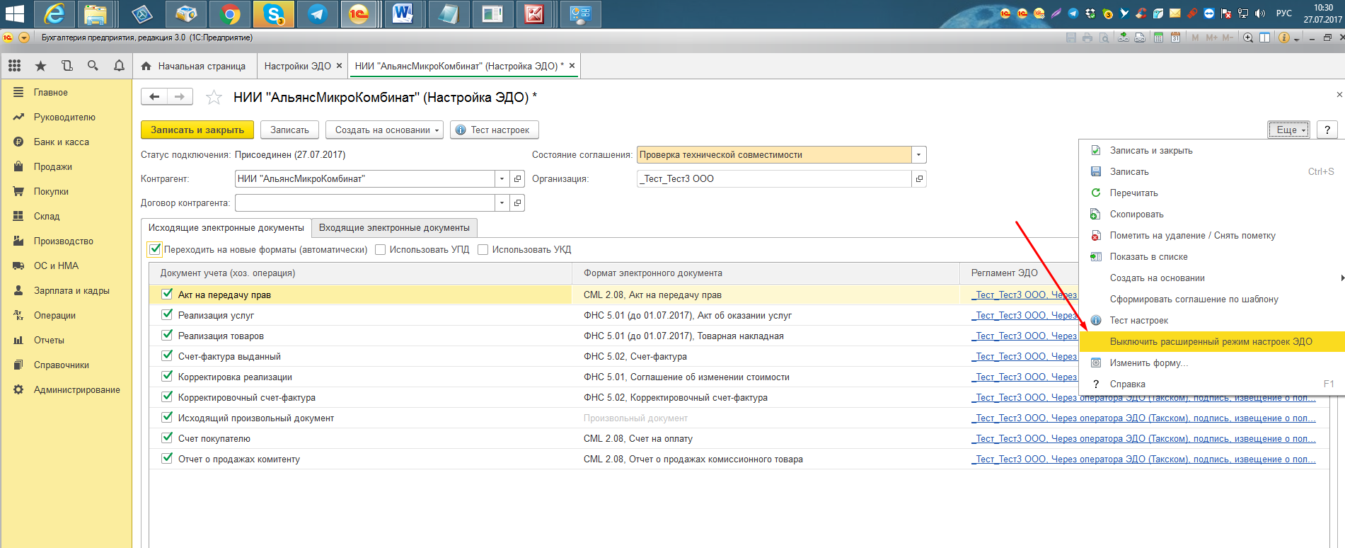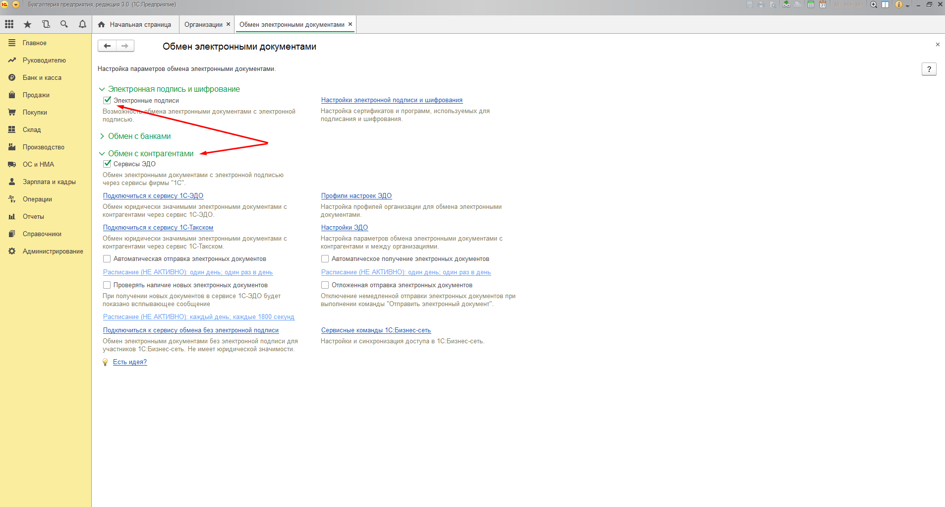 3. Убедиться, что в настройках обмена электронными документами включен обмен электронными документами и использование электронной подписи.
