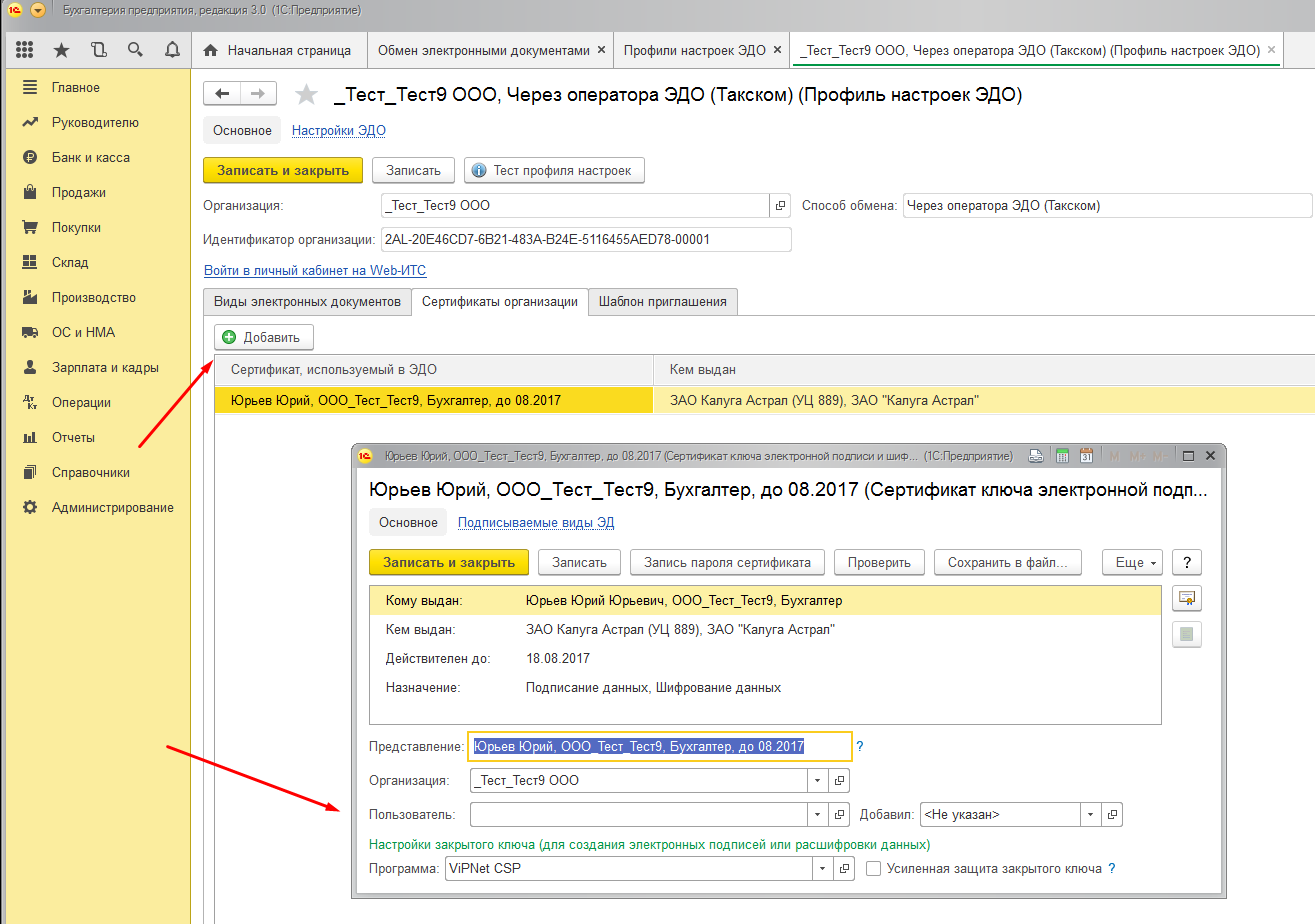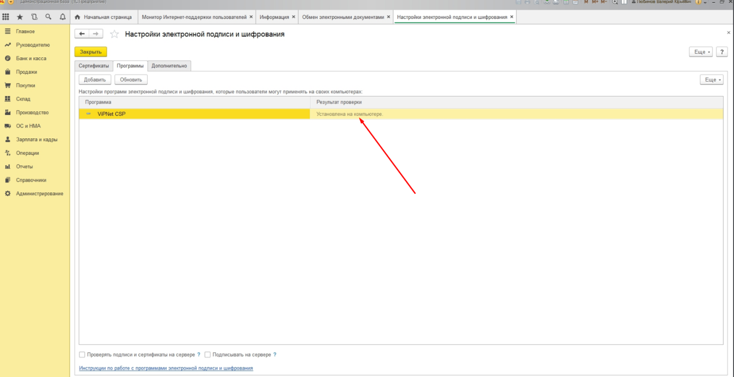 4. Убедиться, что на компьютере, с которого происходит настройка ЭДО в «новой» базе, установлены средства криптозащиты, а так же сертификат и закрытый ключ электронной подписи. Например, при использовании VipNet CSP:
