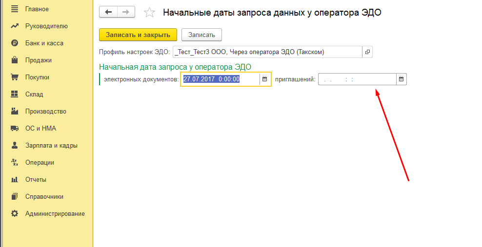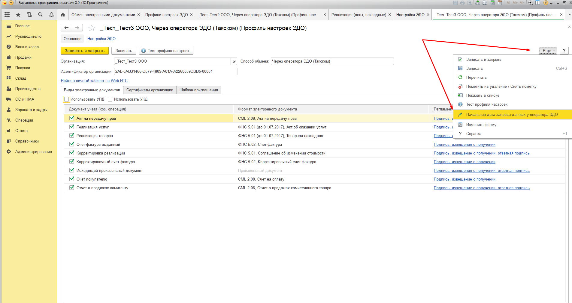 6. В созданном и настроенном «Профиле настроек ЭДО» по команде «Еще» - "Начальная дата запроса данных у оператора ЭДО"