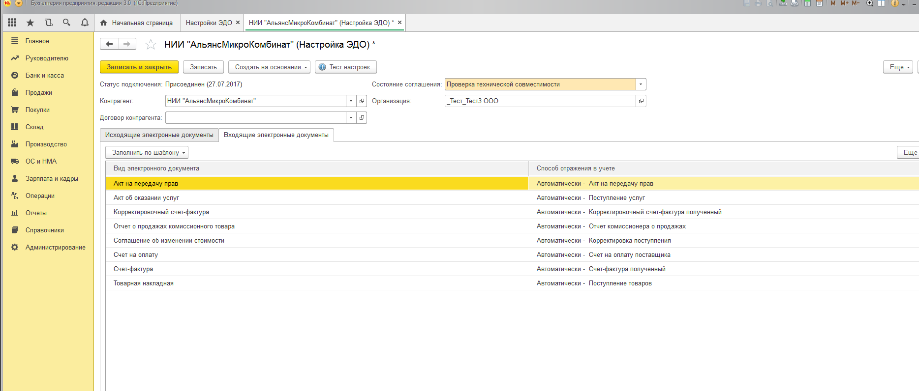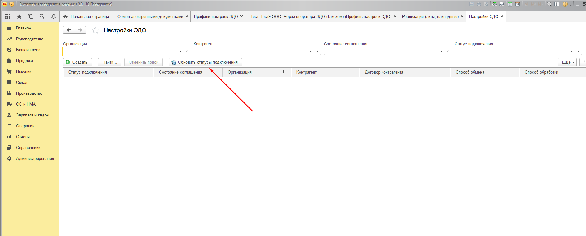 7. В «Настройках ЭДО» вызвать команду «Обновить статусы подключения»,