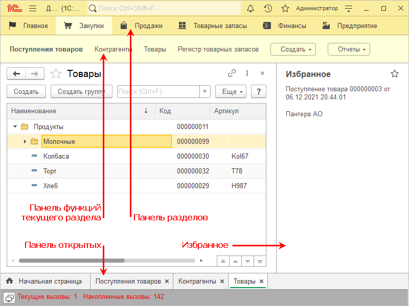 Интерфейс клиентского приложения это набор стандартных панелей, которые вы можете расположить на экране определенным образом. Например, это панель разделов, панель функций текущего раздела, избранное, панель открытых и т. д.