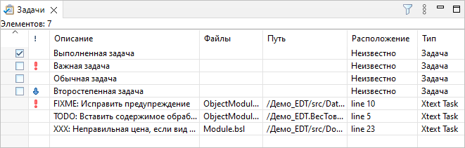 Автоматически 1C:EDT создает задачи на основе комментариев, содержащихся в модулях. Для создания задач выбираются строки, содержащие //TODO, //FIXME и //XXX.