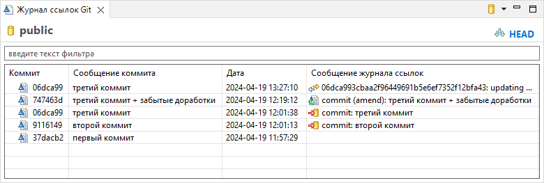 Панель Журнал ссылок Git показывает историю изменения голов веток на