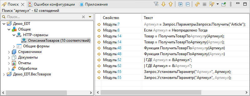 Поиск ссылок в модулях выполняется после того, как найдены ссылки в объектах конфигурации (т. к. занимает больше времени). Панель Поиск наполняется результатами по мере нахождения ссылок, не блокируя интерфейс. Ссылки, найденные в модулях, группируются по имени модуля.
