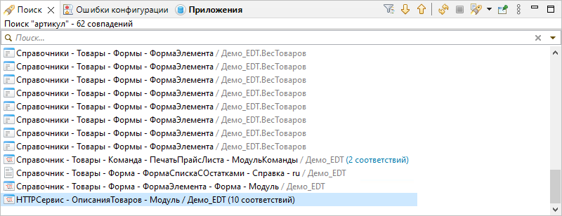 Если выполнялся поиск в конфигурациях, то панель показывает элементы конфигурации, в которых найдена искомая строка.