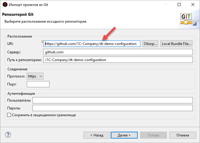 - В поле URI введите адрес репозитория фирмы «1С» — https://github.com/1C-Company/dt-demo-configuration и